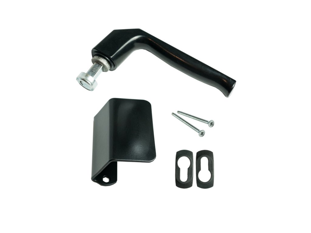 Sada jedné kliky a jednoho madla pro dveře nebo bránu. Rukojeť i držadlo jsou opatřeny černým práškovým lakem. Spolu s klikou a madlem se dodává montážní příslušenství, šrouby, podložka a plastové rozety pro vložku zámku.