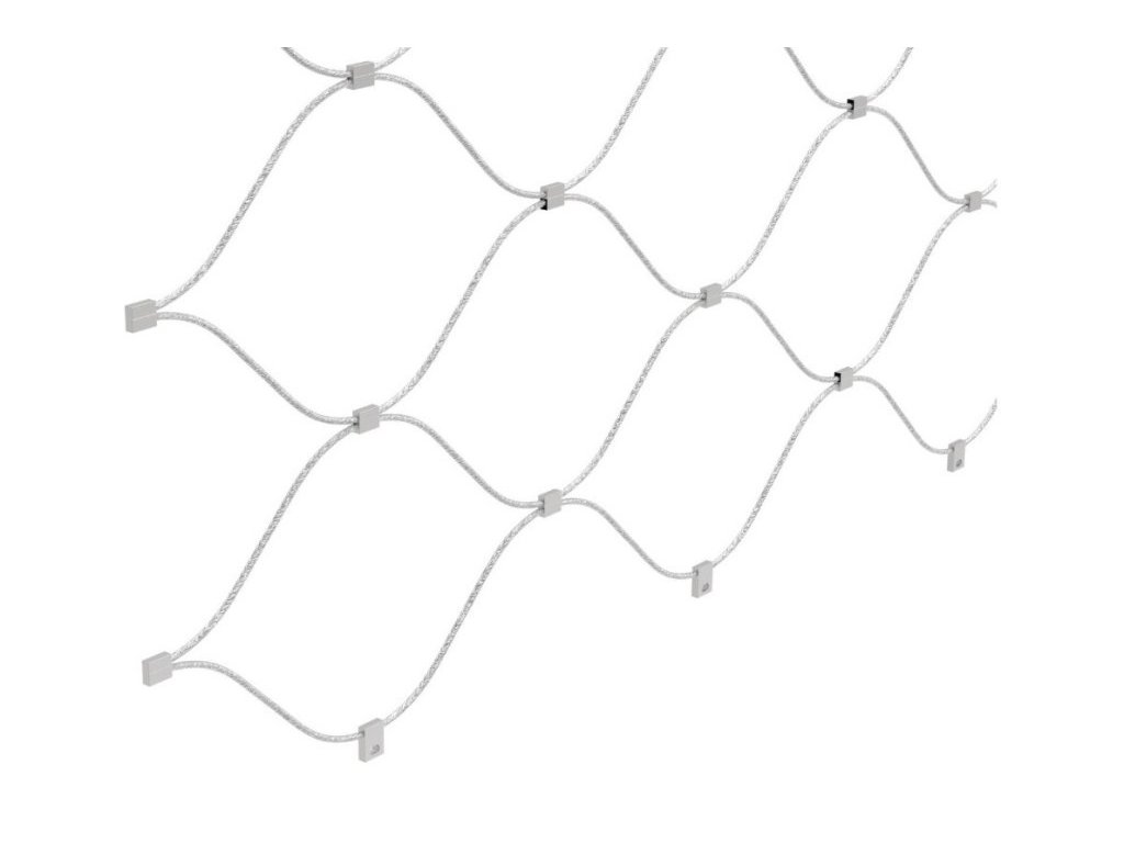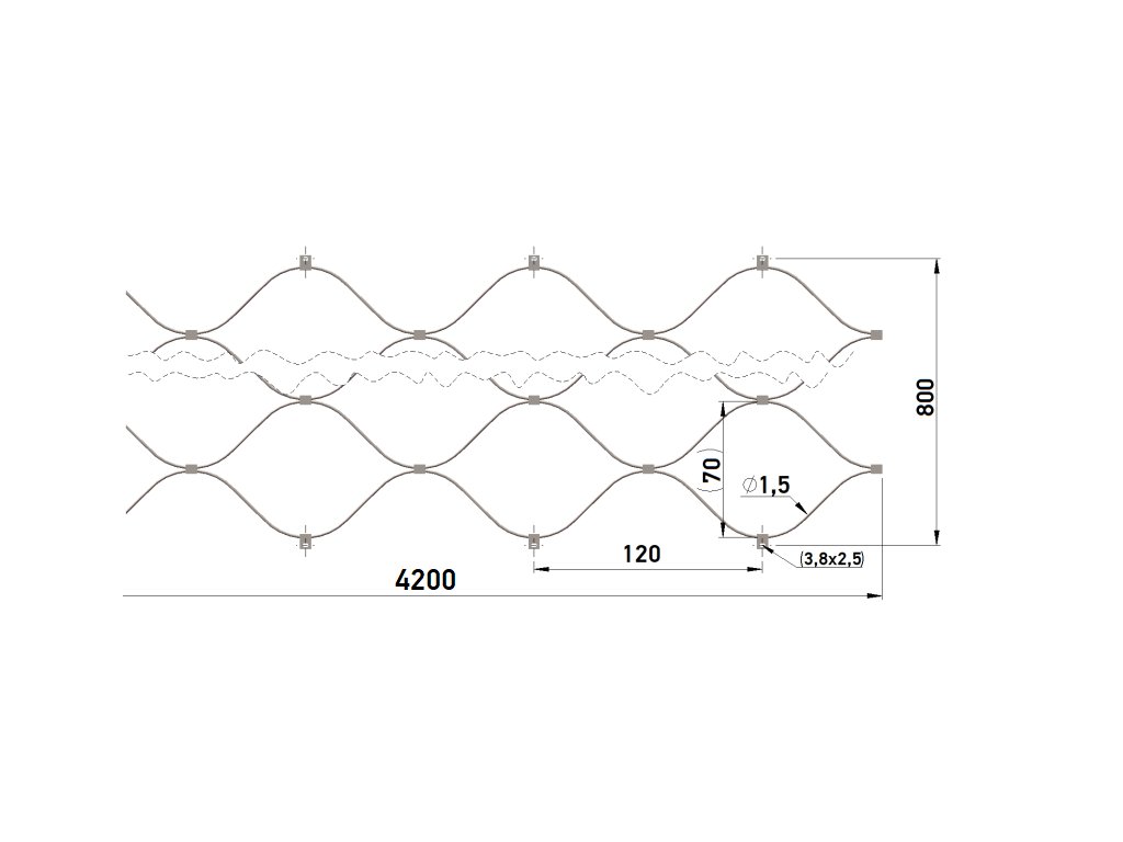 Nerezová výplňová síť, pletená z nerezového drátu o průměru 1,5 mm, s velikostí ok 70x120 mm z nerezové oceli AISI316.