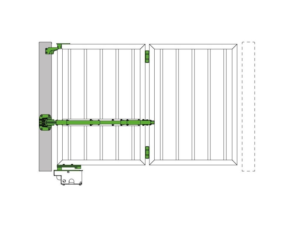 Skládací mechanismus je navržen pro automatizaci s podzemním pohonem, s minimálním pohybem otáčení 180°. Rychlost otáčení pohonu do polohy 180° musí být minimálně 60 sekund, aby se zabránilo pružným účinkům mezi křídly brány.