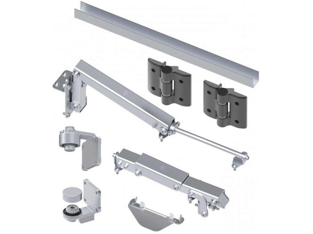 Sestava komponentů pro křídlovou bránu s dvoudílným skládacím křídlem o délce až 5 m. Při použití dva sestavy, které můžete harmonikově sklopit křídlovou bránu s šířkou průjezdu až do 10 m. Dvoudílná skládací křídlová brána je užitečná zejména v případě, že auto parkujete přímo za bránou, pokud je těsně za bránou svah nebo pokud existuje jiná překážka, která znemožňuje instalaci klasického jednodílného křídla. Díky tomuto mechanismu můžete ušetřit až polovinu místa, které byste jinak zabrali rezervoval oblouk popsaný pohybem křídla.
