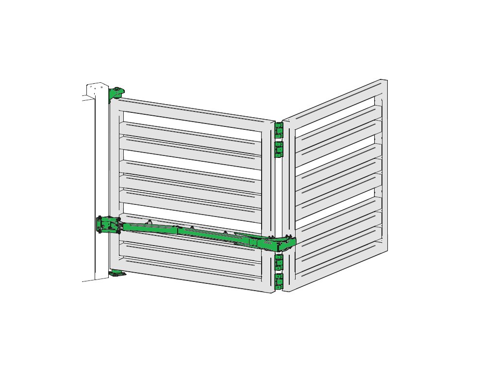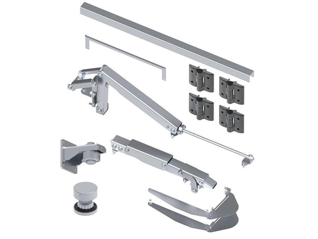 Sestava komponentů pro křídlové brány s dvoudílným skládacím křídlem o délce až 8 m. Pomocí dvou sestav lze harmonicky sestavit křídlovou bránu s šířkou průjezdu až 16 m. Dvoudílná skládací křídlová brána je užitečná zejména v případě, že auto parkujete přímo za bránou, pokud je těsně za bránou svah nebo pokud existuje jiná překážka, která znemožňuje instalaci klasického jednodílného křídla. Díky tomuto mechanismu můžete ušetřit až polovinu místa, které by jinak bylo vyhrazeno oblouku opsanému pohybem křídla.