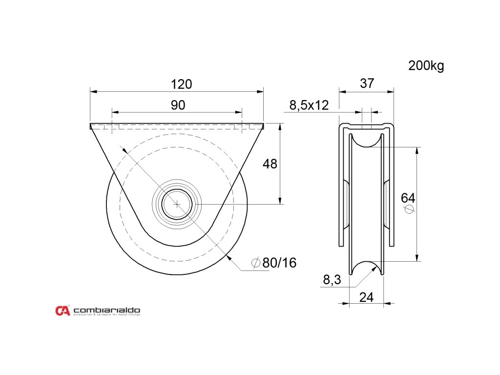 Pozinkované kolo se šroubovým držákem, pro kolejnici ve tvaru U, s vysoce kvalitními ložisky Combi Arialdo italské výroby. Pro kolejnici Ø16 mm.