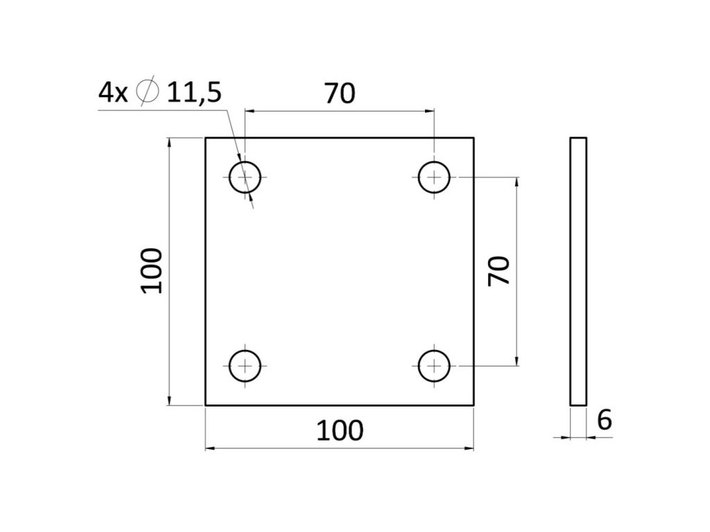 Rozměry 100 × 100. Tloušťka 6 mm. Rozteč otvorů 70x70. Průměr otvoru 11,5 mm. Surová ocel.