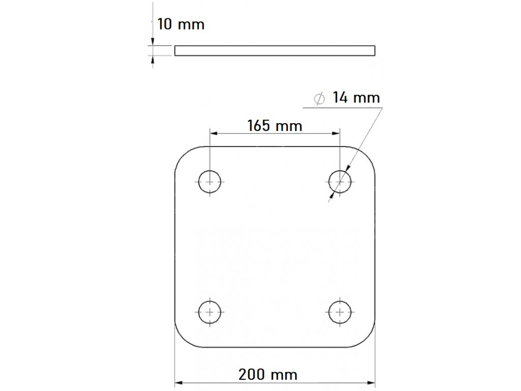 Rozměr: 200x200 mm. tloušťka: 10 mm. rozteč otvorů: 165 mm. průměr otvoru: 14 mm. Surová ocel