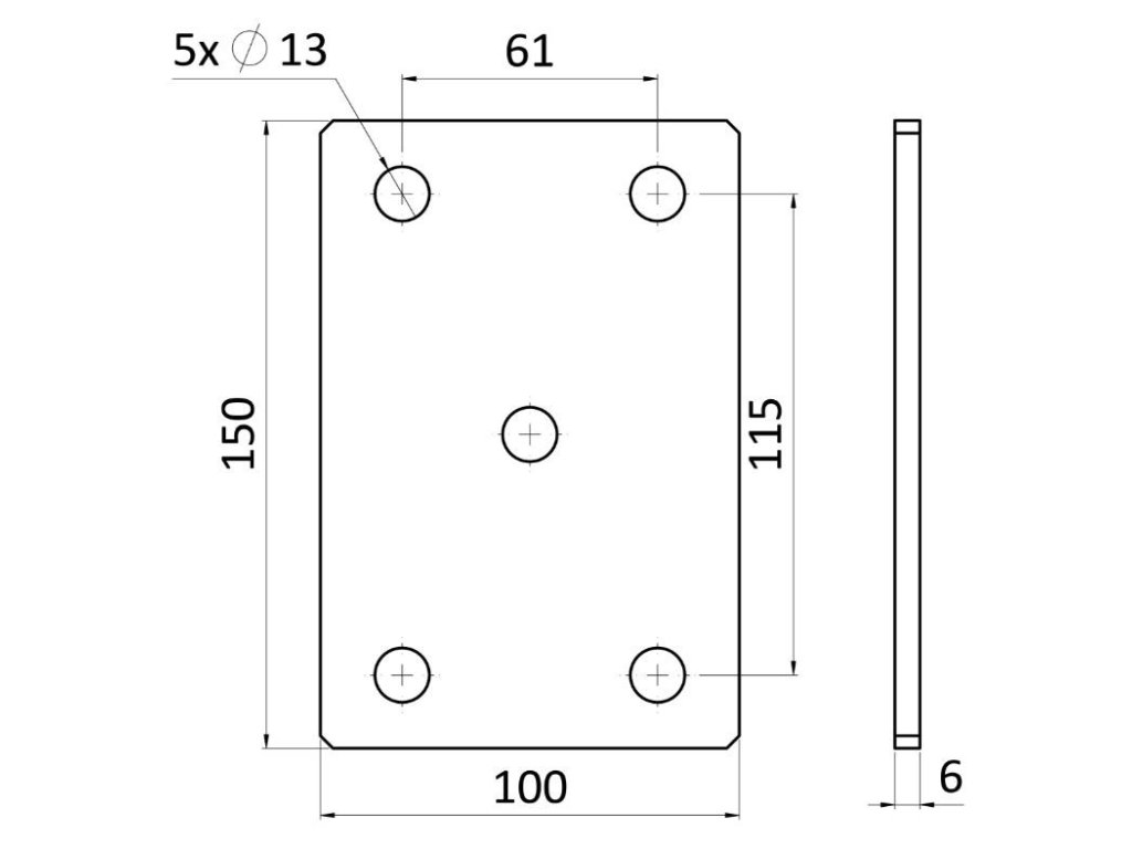 Rozměry 100 × 100. Tloušťka 8 mm. Rozteč otvorů 61x115. Průměr otvoru 13 mm. Surová ocel.