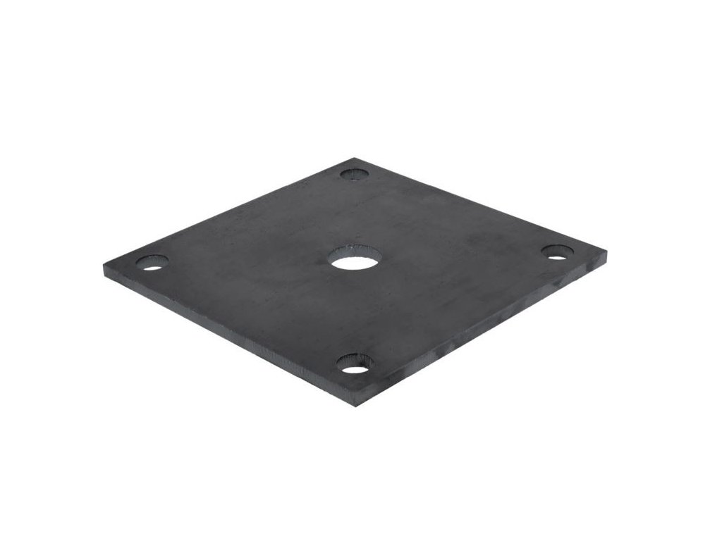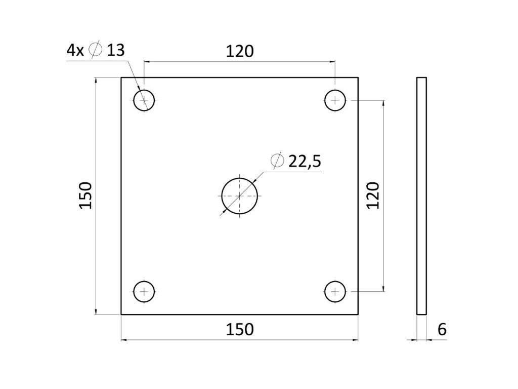 Rozměry 150 × 150. Tloušťka 6 mm. Rozteč otvorů 120x120. Průměr otvoru 13 mm. Surová ocel.