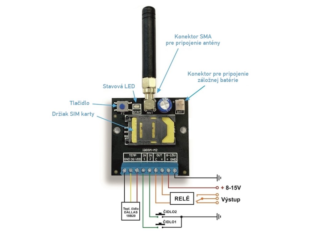 Výstup pro ovládání prostřednictvím SMS, voláním: | přímé připojení relé až do 100 mA |