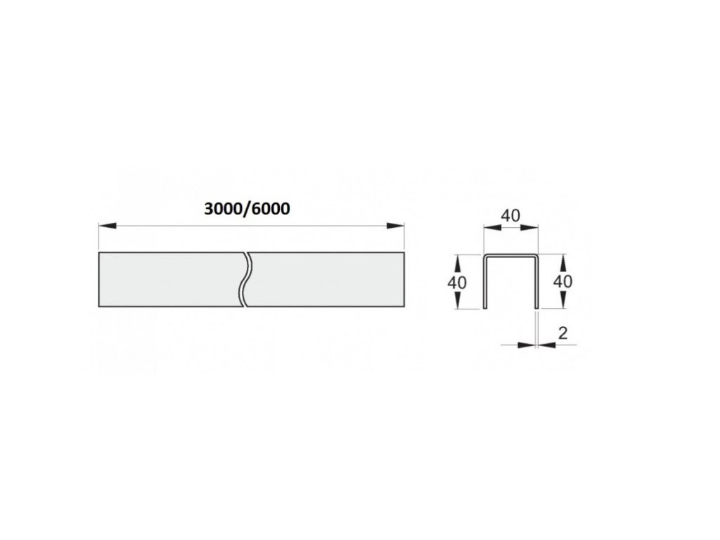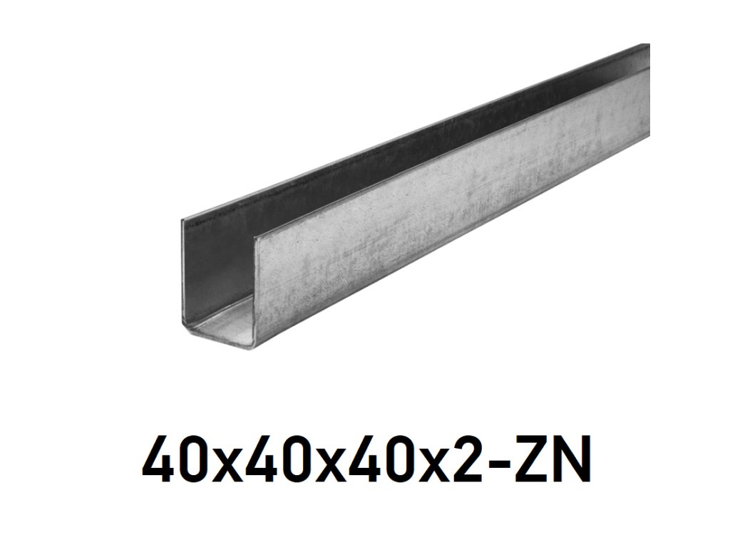 Pozinkovaný U-profil s rozměry 40x40x40mm, tloušťkou stěny 2mm a délkou 3 nebo 6m.