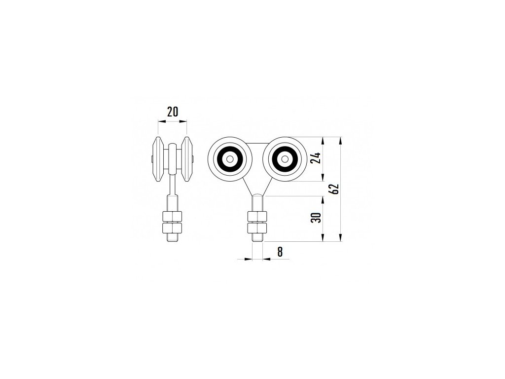 Ve spodní části je závit M8, který lze použít k ukotvení vozíku k horní části závěsné brány několika způsoby - například pomocí kotevní přírubou s ložiskem. V závislosti na způsobu upevnění je možné dodatečné nastavení výšky na závitu. Dodává se včetně matic.