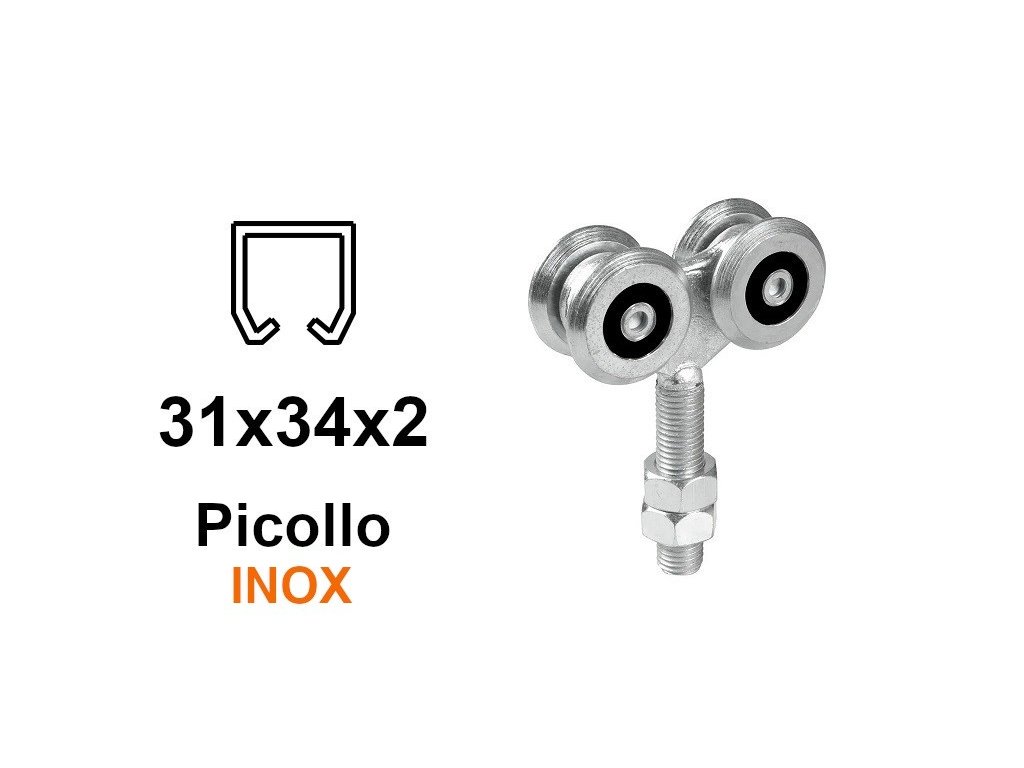 Vozík pro zavěšení brány, výklopných dveří nebo střešního okna. Vozík má čtyři kovové válečky s kuličkovými ložisky a je určen pro C-profil 34 × 31 × 2,0 mm a C-profil 33 × 34 × 2,0 INOX.