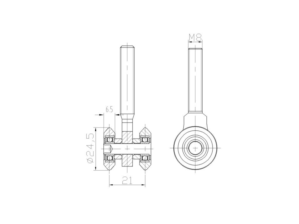 Ve spodní části je závit M8, který lze použít k ukotvení vozíku k horní části závěsné brány několika způsoby - například pomocí kotevní přírubou s ložiskem. V závislosti na způsobu upevnění je možné dodatečné nastavení výšky na závitu. Dodává se včetně matic.