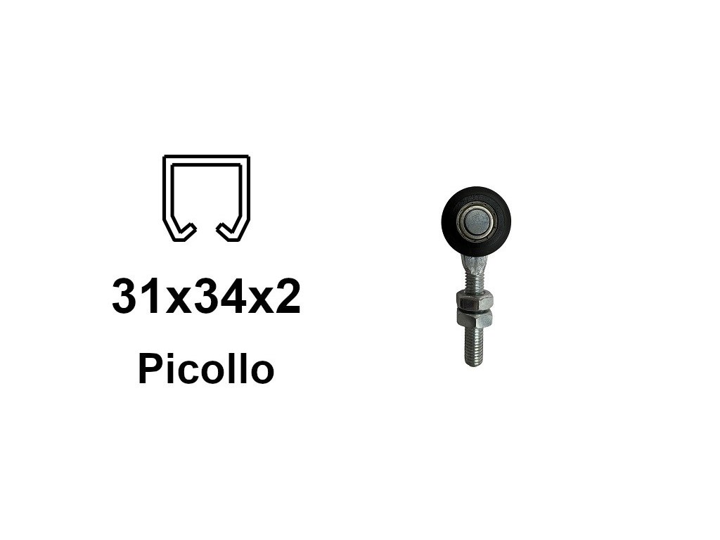 Vozík pro výklopné dveře, vrata nebo střešní okno. Vozík má dva nylonové válce s kuličkovými ložisky a je určen pro c-profil 34 × 31 × 2,0 mm. Nylonové válečky zajišťují tišší chod vozíků v profilu C.