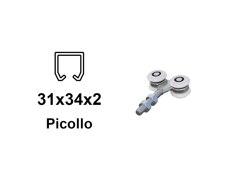 Vozík pro výklopné dveře, vrata nebo střešní okno. Vozík má čtyři nylonové válečky s kuličkovými ložisky a je určen pro c-profil 34 × 31 × 2,0 mm. Nylonové válečky zajišťují tišší chod vozíků v profilu C.