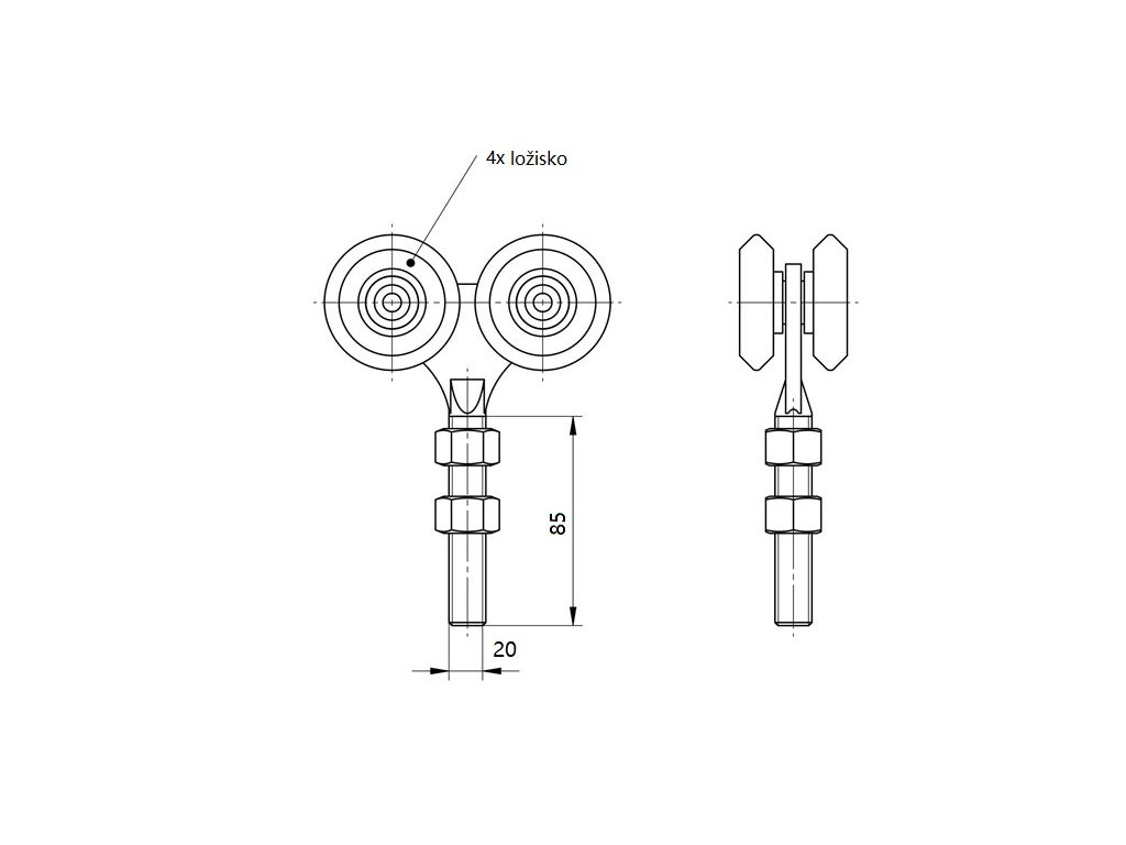 Ve spodní části je závit M20, který lze použít k ukotvení vozíku k horní části závěsné brány několika způsoby - například pomocí kotevní přírubou s ložiskem. V závislosti na způsobu upevnění je možné dodatečné nastavení výšky na závitu. Dodává se včetně matic.