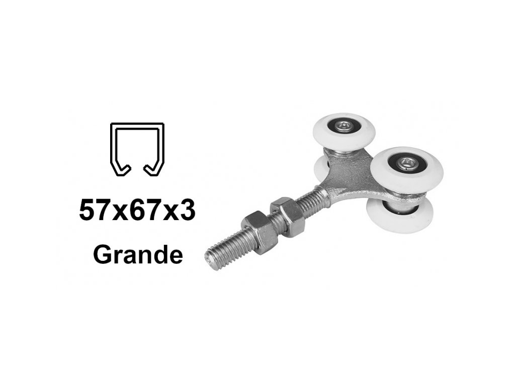Vozík pro výklopné dveře, brány nebo střešního okna. Vozík má čtyři nylonová kolečka s kuličkovými ložisky a je určen pro výklopný C-profil 57×67×3,0 mm. Nylonové válečky zajišťují tišší chod vozíků v profilu C.