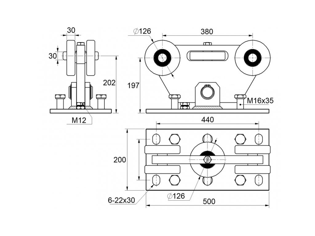 Celokovový vozík pro samonosné posuvné brány s hmotností až 1000 kg a šířkou průjezdu až 13 m.