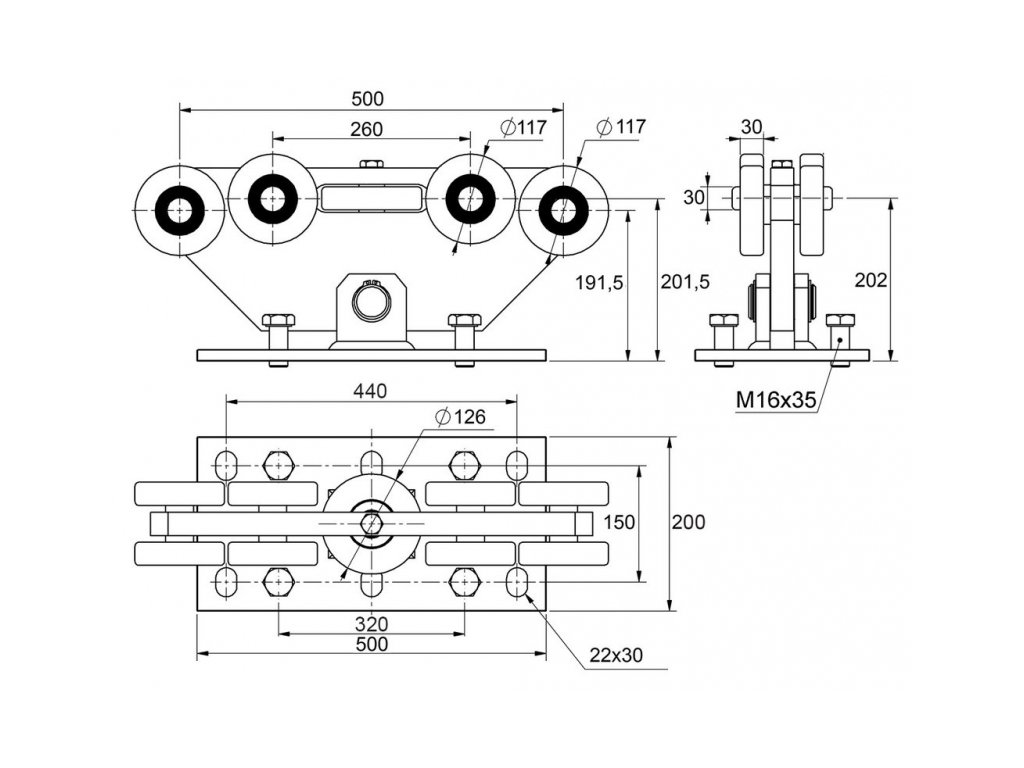 Celokovový vozík pro samonosné posuvné brány s hmotností až 1500 kg a šířkou průjezdu až 15 m.