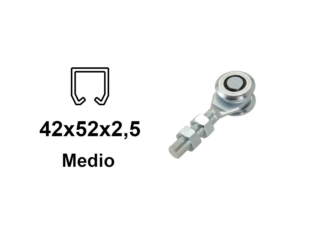 Vozík pro zavěšení brány, výklopných dveří nebo střešního okna. Vozík má dva kovové válečky s kuličkovými ložisky a je určen pro c-profil 42 × 52 × 2,5 mm.