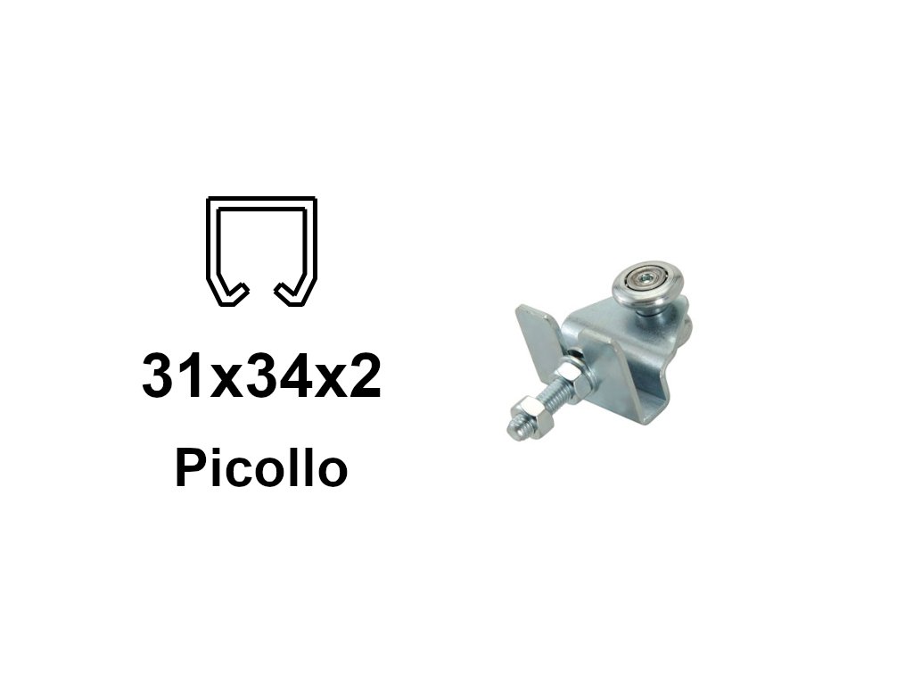 Vozík pro zavěšení brány, výklopných dveří nebo střešního okna. Vozík má dva kovové válečky s kuličkovými ložisky a spolu se základnou je určen pro c-profil 34 × 31 × 2,0 mm.