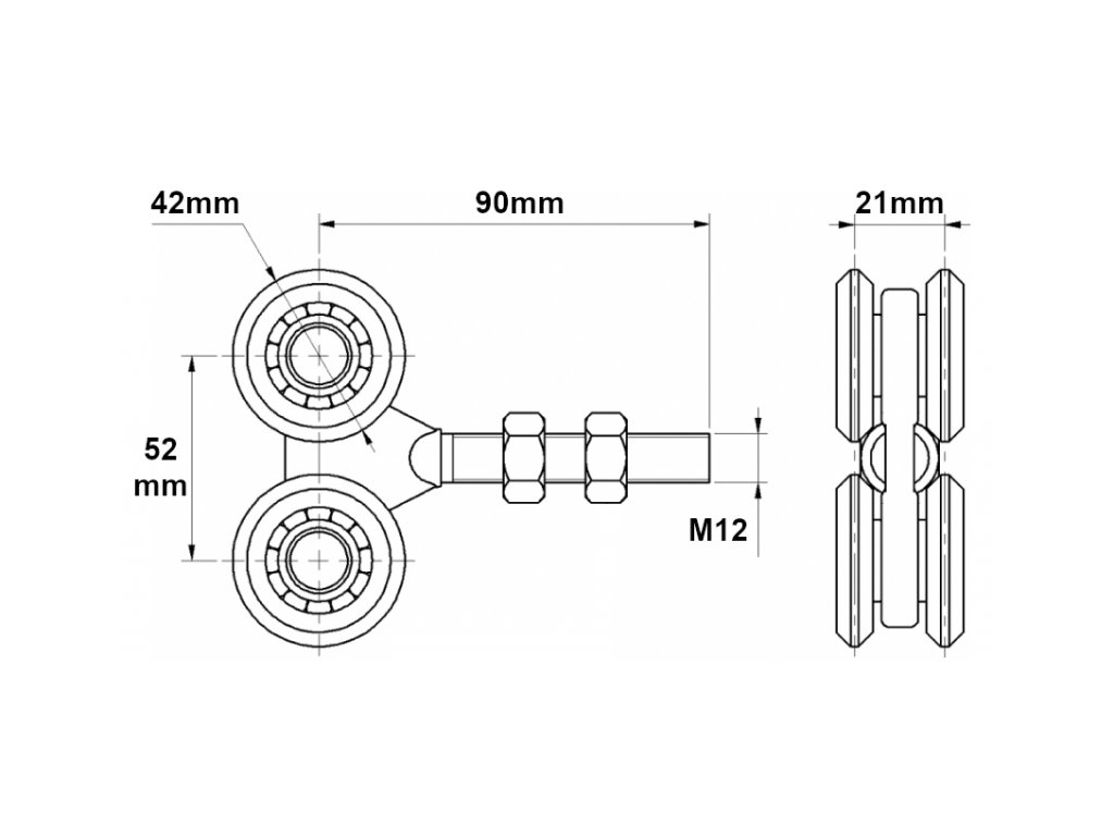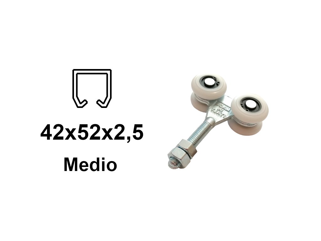 Vozík pro zavěšení brány, výklopných dveří nebo střešního okna. Vozík má čtyři nylonové válečky s kuličkovými ložisky a je určen pro c-profil 42 × 52 × 2,5 mm.