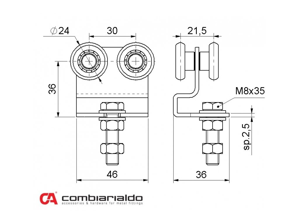 Ve spodní části je závit M8, který lze použít k ukotvení vozíku k horní části závěsné brány několika způsoby. V závislosti na způsobu upevnění je možné dodatečné nastavení výšky na závitu. Dodává se včetně matic.