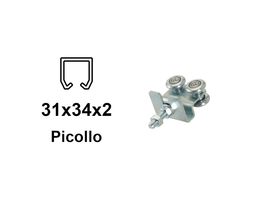 Vozík pro zavěšení brány, výklopných dveří nebo střešního okna. Vozík má čtyři kovové válečky s kuličkovými ložisky a s podstavcem je určen pro c-profil 34 × 31 × 2,0 mm.
