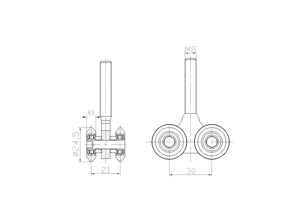 Ve spodní části je závit M8, který lze použít k ukotvení vozíku k horní části závěsné brány několika způsoby - například pomocí kotevní přírubou s ložiskem. V závislosti na způsobu upevnění je možné dodatečné nastavení výšky na závitu. Dodává se včetně matic.
