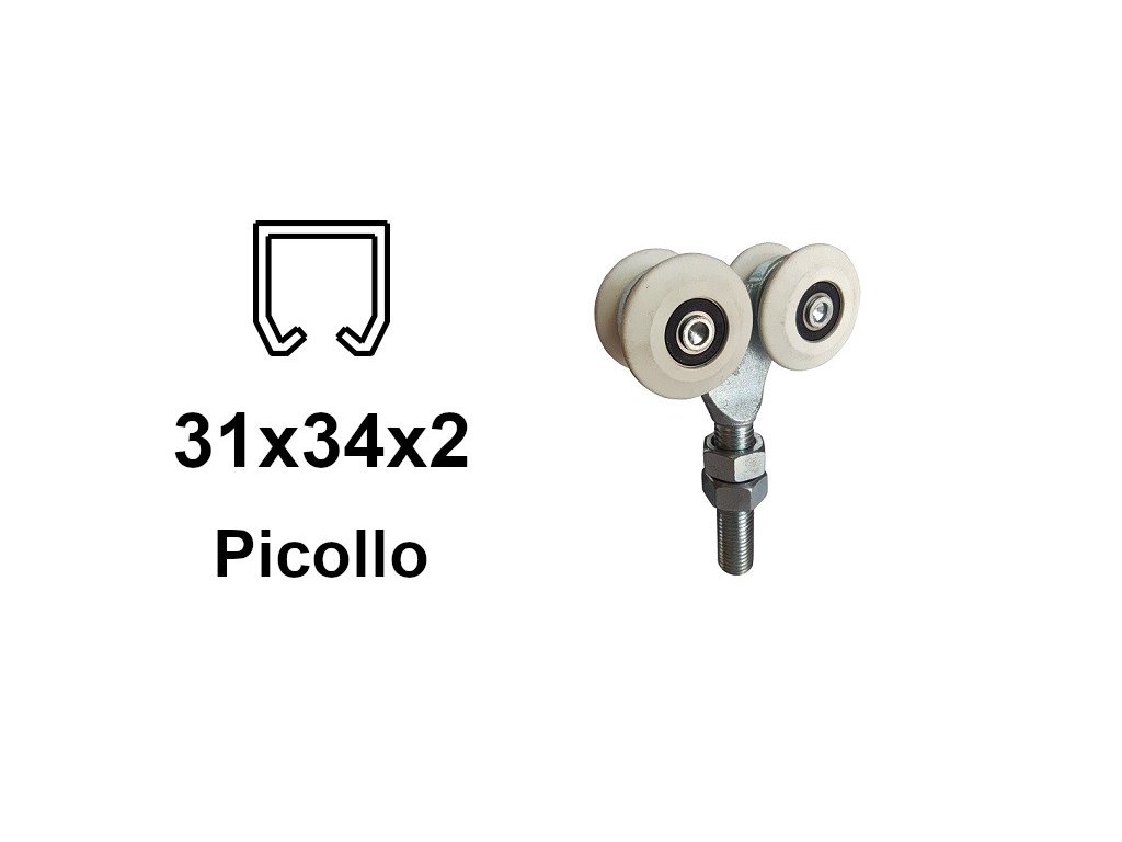 Vozík pro výklopné dveře, vrata nebo střešní okno. Vozík má čtyři nylonové válečky s kuličkovými ložisky a je určen pro c-profil 34 × 31 × 2,0 mm. Nylonové válečky zajišťují tišší chod vozíků v profilu C.