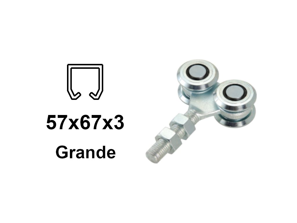 Vozík pro zavěšení brány, výklopných dveří nebo střešního okna. Vozík má čtyři kovové válečky s kuličkovými ložisky a je určen pro profil C 57 × 67 × 3 mm.