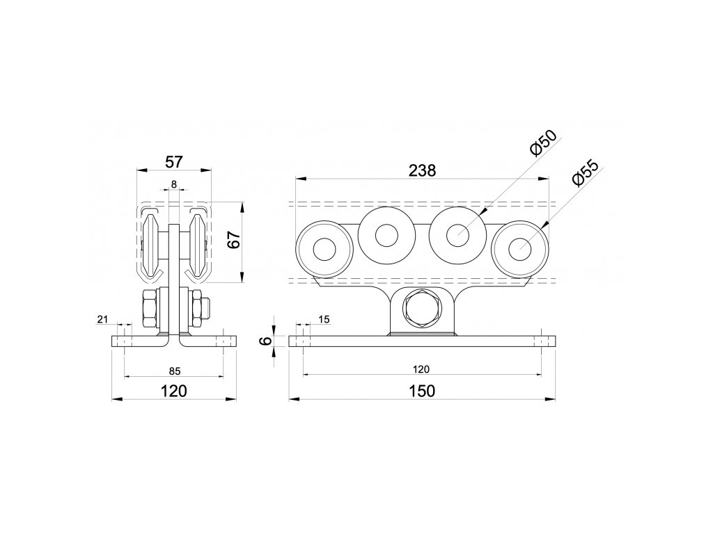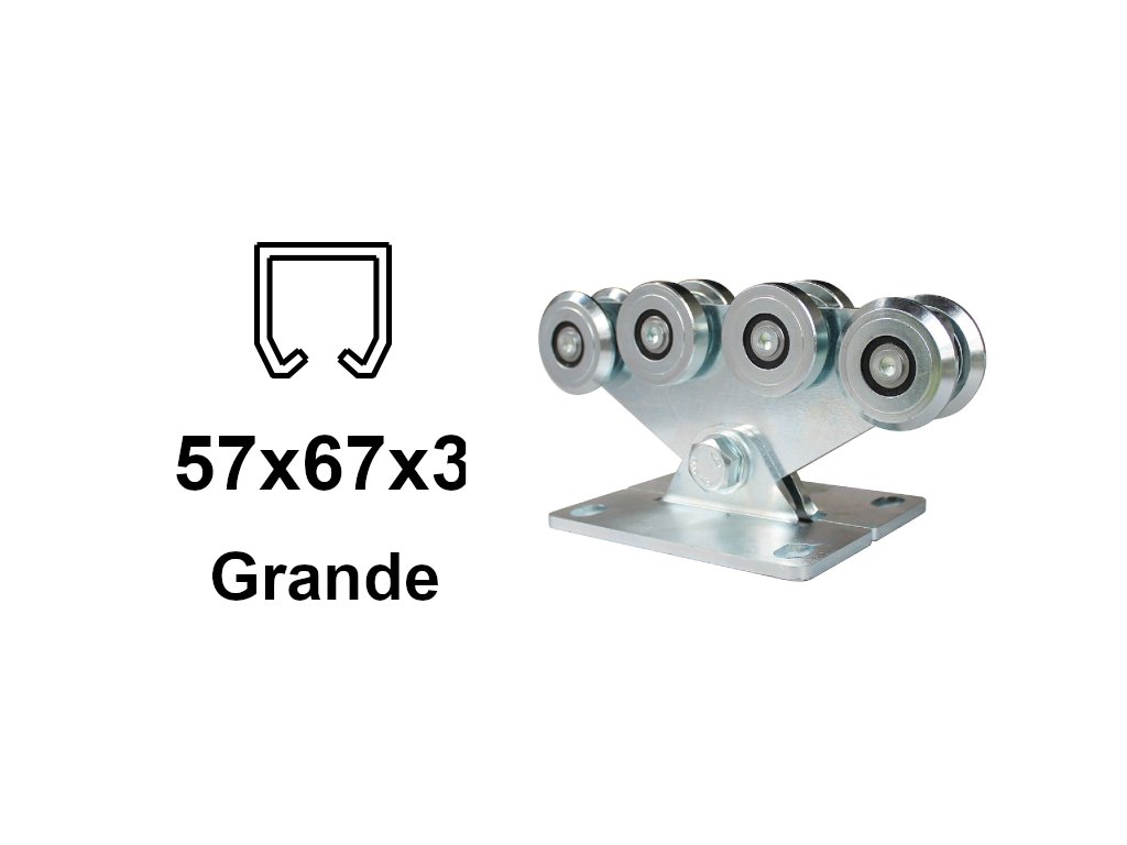 Vozík pro zavěšení brány, výklopných dveří nebo střešního okna. Vozík z pozinkované oceli má 8 kovových koleček a je určen pro c-profil 57×67×3,0 mm.
