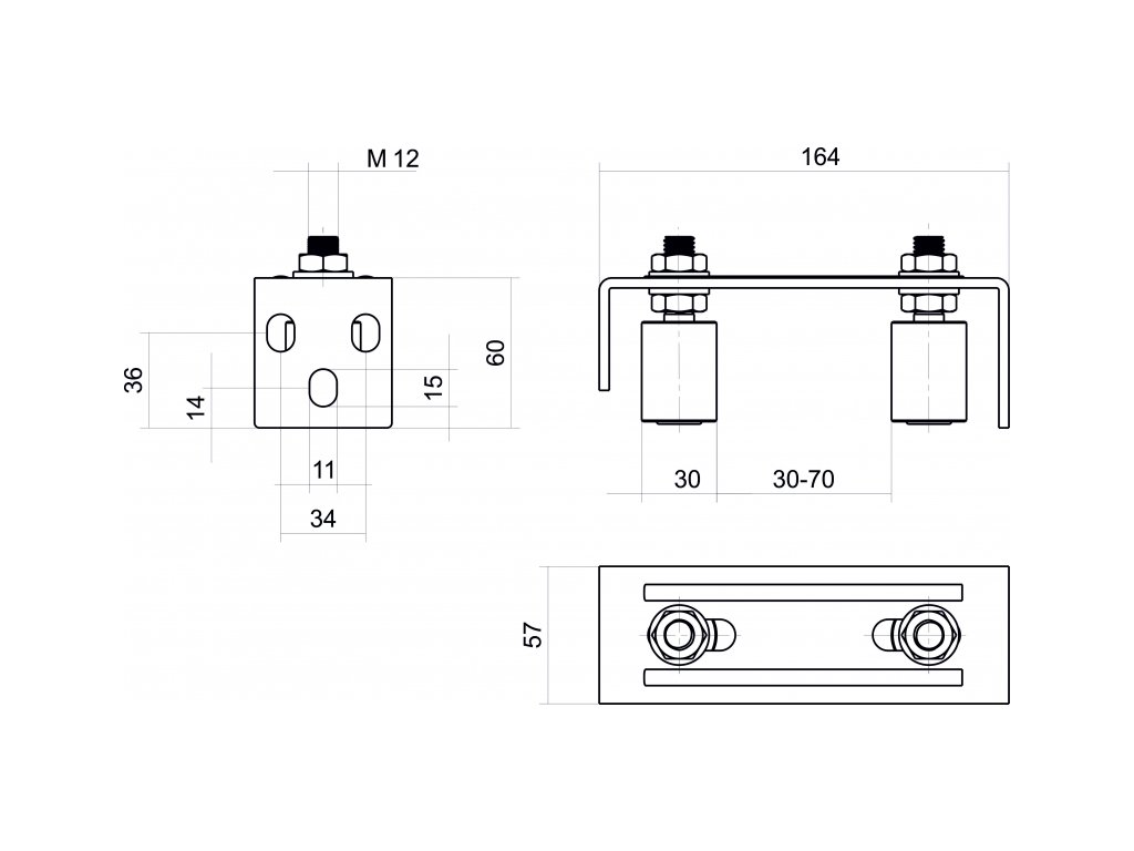 Válečky svírají horní profil brány, osa brány probíhá mezi válečky. Role mají nastavitelnou šířku 30 - 70 mm. Držák je INOX.