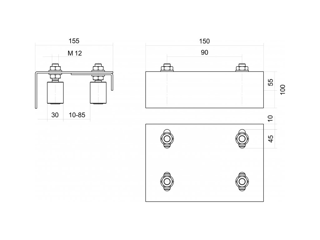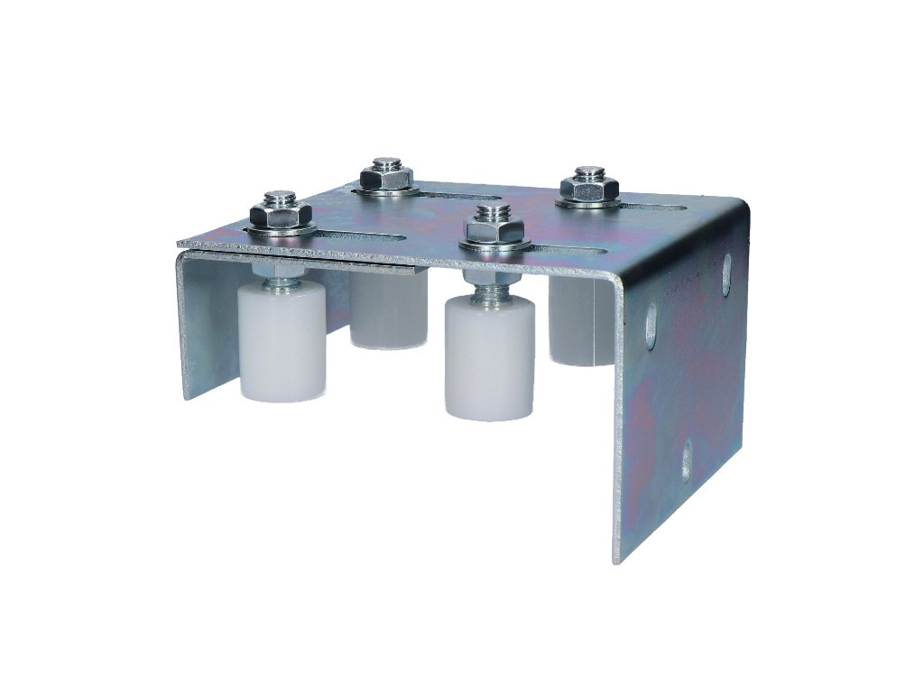 Horní vedení pro posuvné brány se čtyřmi nastavitelnými válečky. Průměr použitých válců je 30 mm a tyto roky jsou nylonové. Tento čtyřválcový držák je určen k přivaření nebo přišroubování ke sloupku nebo ke stávajícímu oplocení na vašem pozemku.
