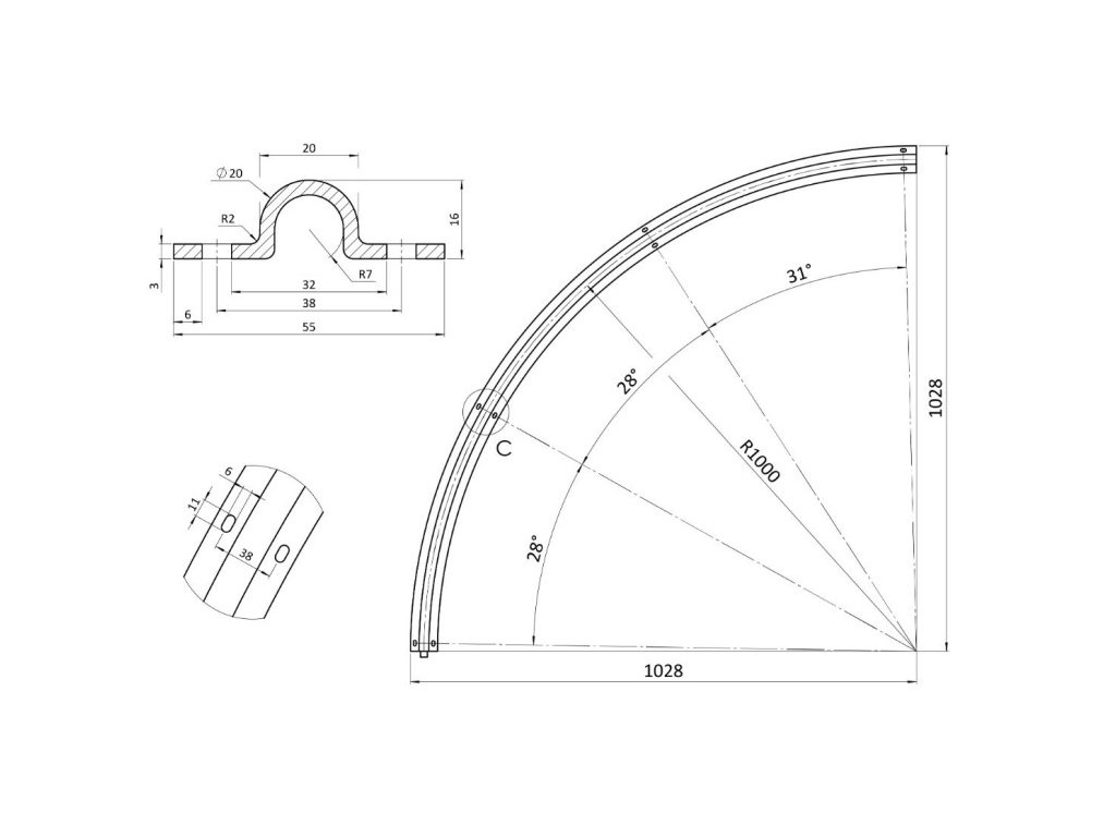 Zakřivená kolejnice U20 pro obloukovou bránu, poloměr 1,0 m