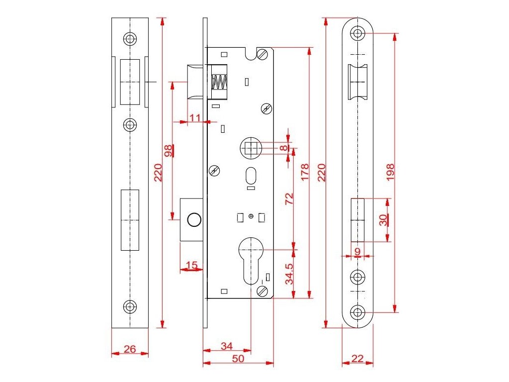 Šířka zámku je 50 mm a jeho čelní strana má rozměry 22x220 mm. Rozteč zámku je 72 mm.