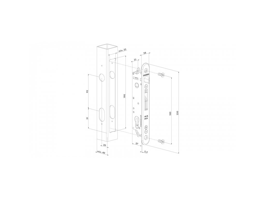 Hákový zámek LOCINOX FORTYLOCK z nerezové oceli s čelní deskou, která zabraňuje vniknutí nečistot do dveří. Zámek obsahuje západka, která zabraňuje nežádoucímu zvednutí brány v uzamčeném stavu. Hrad je vyroben za umytý klasickou bábou.