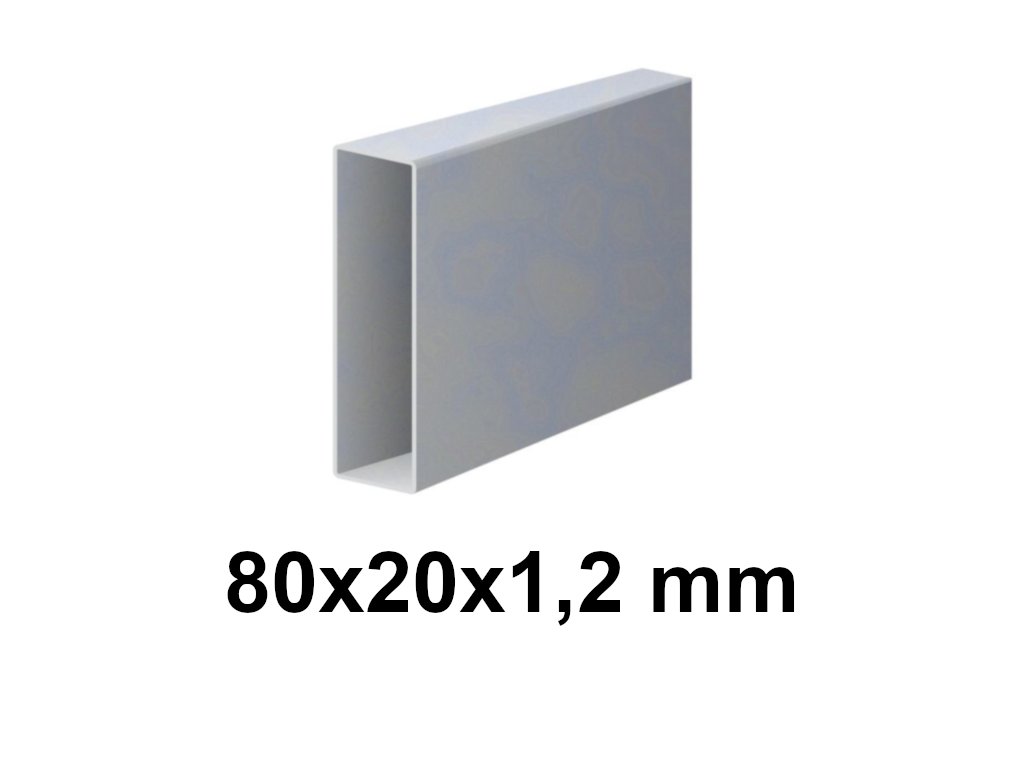 Uzavřený jäklový profil o rozměrech 80x20 mm a tloušťce 1,2 mm. S pozinkovaným povrchem, hladké.