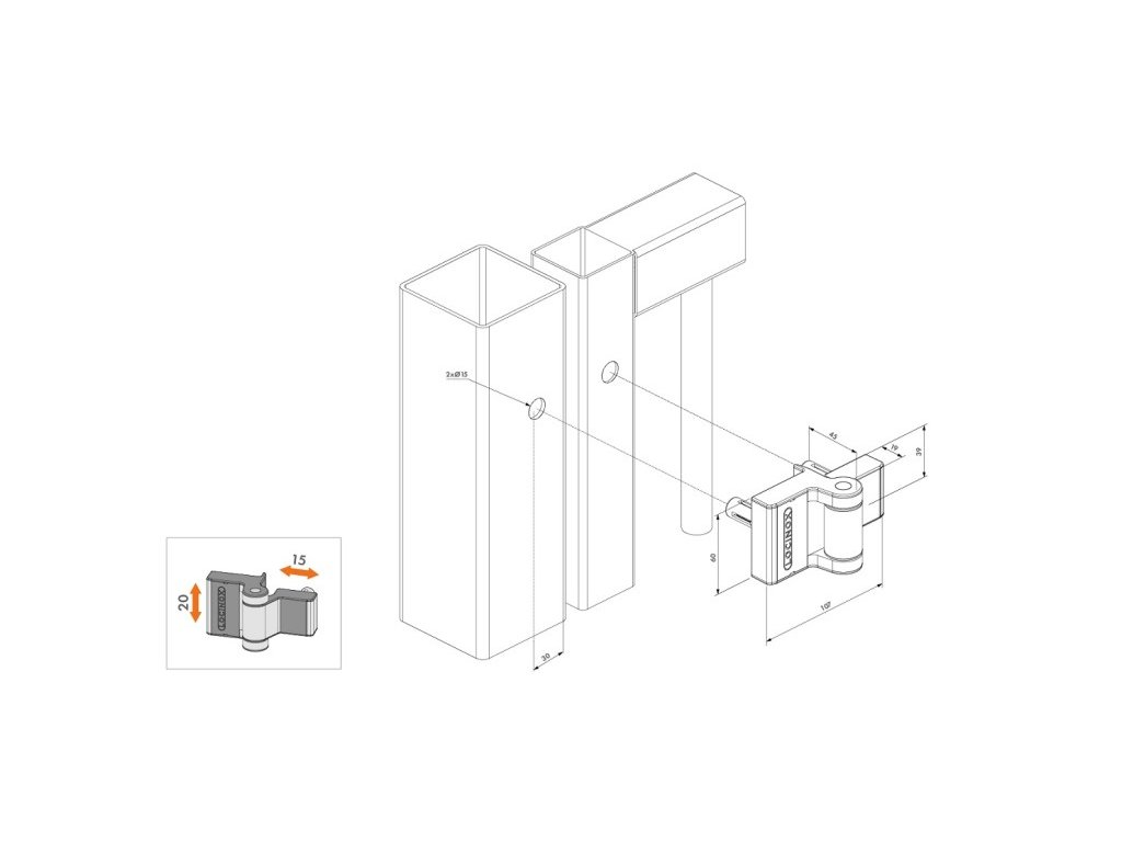Přesné vyladění závěsu pro vaši bránu je možné s horizontálním vyrovnáním až o 20 mm a vertikálním vyrovnáním až o 15 mm.
