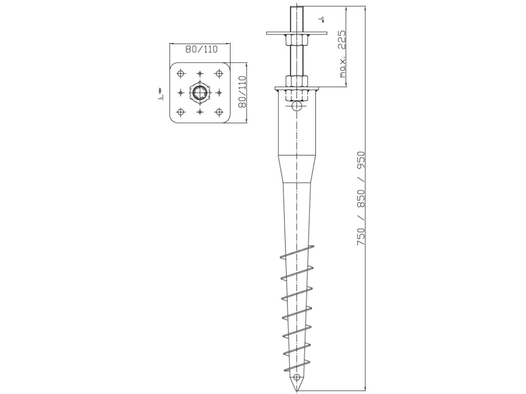 Zemní šroub s pilířovou kotvou 80×80×750, 110×110×850, 110×110×950